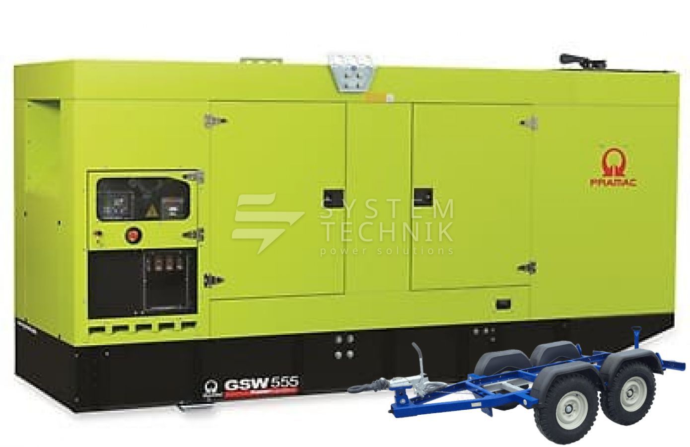 - Дизельный генератор Pramac GSW 555 V 230V 3Ф В кожухе на прицепе